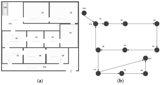 Figure 6a shows the previous distribution of indoor space and its directed graph. As shown, both the stairs and the corridors are considered as cells.