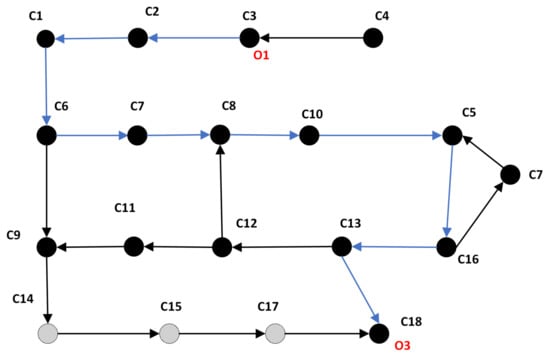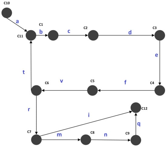 Definition 6. Let G be a directed graph with the set of cells C = . The directed indoor capacity values at time (t) of the digraph G are (1, 0, −1, −2), defined by: Note that the capacity values are determined by the admin, taking into account the size of the indoor space, the cells and the timing. For example, in