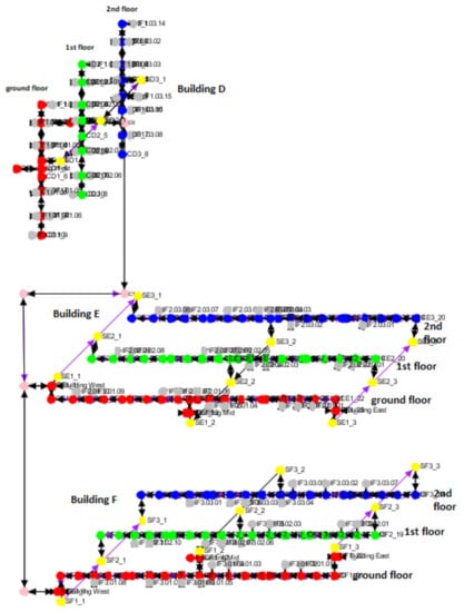 Figure 10 shows the floor plan of the building and the simulated positioning points of moving objects. Buildings D, E and F of Telkom University, Indonesia, were selected as the real data experimental environment. The experiment involved routing between the cells inside these buildings. Although these buildings are actually connected with each other through corridors and thus can be considered as one building, we test the routing in different scenarios: as the same building and as different buildings to determine the effect of the number of hops between rooms. Note that the buildings have three floors and extend into two wings. To support related queries, the buildings are assumed to have directed indoor spaces, with few changes in the corridors, as we assigned some corridors to have a certain direction for evaluation purposes. The level of each store and brand was manually established.