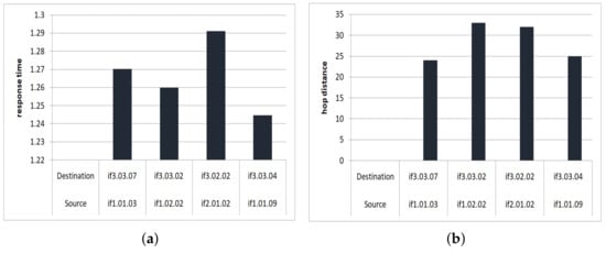 23], our proposed system reduced the number of false hits by more than eight times in some cases. This system can accommodate the number of hops of the routing system in addition to the cells’ densities, which can play an important role in determining the correct shortest path between any cells or moving objects. Moreover, the proposed routing algorithm still performs efficiently without any significant impact resulting from an increase in the number of hops in the same or different buildings. The impact of the increased number of hops in the same/different buildings is less than 2% in some cases, while, in others, it performs more efficiently even with more hops between the objects in the same or different buildings. For example, for the first case of regular density performance, the number of hops of different building is 29 hops and six hops for the same building; however, for the performance in the same building case is is slightly higher (2.4%) compared with the different building, even though it has a higher number of hops. Moreover, a comparison of four routing cases in the same building and different buildings with low cell densities shows that the impact of the extreme density compared with that of lower densities is 7% in some cases. However, in some cases, it is less than 3%. Therefore, the performance is still efficient, and the density does not have a significant effect on the performance of the proposed algorithm.