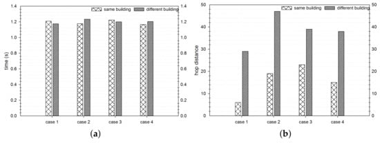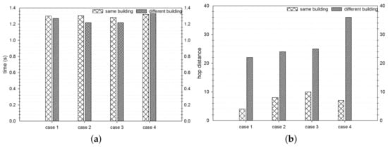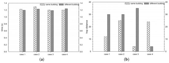 Figure 19 shows the comparison of four routing cases in the same building and different buildings with extreme cells densities. Here, the response time is slightly higher in most cases compared with regular or low densities. Here, we notice that, although the extreme densities cases have a slightly higher response time, the performance is still efficient, and the density does not have a significant effect on the performance of the proposed algorithm.