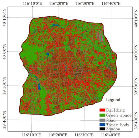 A land cover classification map of the study area is shown in Figure 3. The total area of Beijing within the 6th Ring Road is 2268.72 km2. The areas of buildings, roads, water bodies, shadows, and green spaces are 665.26, 261.13, 45.71, 90.57, and 1206.05 km2, respectively. Green spaces have the largest contribution, making up more than half of the total area of Beijing. Water bodies make the smallest contribution at 2%.