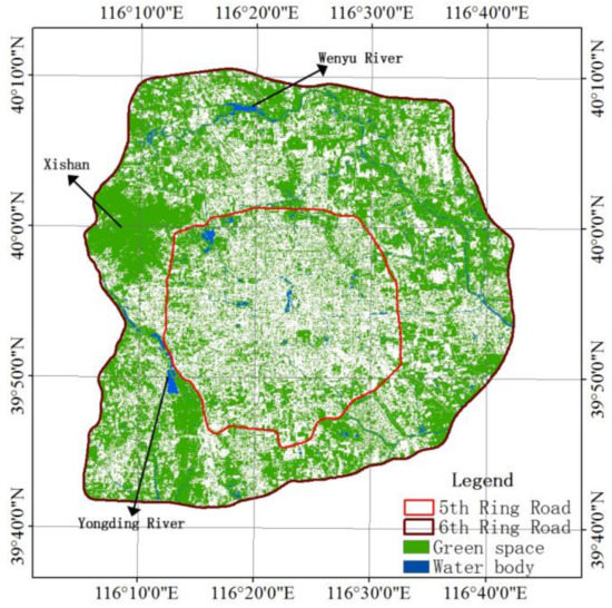 Distribution of green spaces and water bodies within the 6th Ring Road of Beijing.