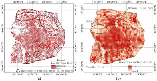 Buildings and roads make up the impervious surfaces of Beijing, and they collectively contribute 41% of its total area. Figure 5a shows the spatial distribution of the buildings and roads in Beijing. Additionally, Figure 5a shows that the buildings in Beijing are spatially distributed in two forms. The first form includes unit neighborhoods of unit building masses with substantial elevations and spacings. The second form includes high-density building areas of continuous low houses. Unit neighborhoods are the main form of building areas in Beijing. The high-density building areas of low houses are mostly scattered between the 5th and 6th Ring Road circles. In addition, there exist high-density building areas of low houses in the downtown areas of Da Zhalan, Qianmen, and Donghuashi. Figure 5b shows the impervious surface densities of Beijing featuring high densities in the downtown areas and low densities in the outskirts. The Xishan Mountains, Yongding River Basin, Summer Palace, Yuanmingyuan, and Olympic Forest Park scenic area have the lowest building densities. The northeast and southeast parts of Beijing, which comprise continuous villages and vast cultivated lands, also have low building densities.
