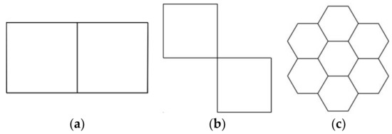 Spatial unit neighborhood of the quadrilateral and hexagonal grids: (a) edge-neighbored quadrilateral grids; (b) corner-neighbored quadrilateral grids; and (c) edge-neighbored hexagonal grids.
