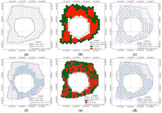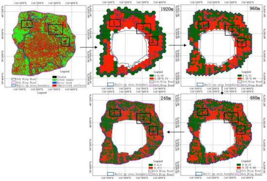 Our measurements revealed that shorter streets in Beijing are approximately 300 m long, whereas longer streets are approximately 1500 m long. As the spatial resolution of the remote-sensing images used herein was 0.8 m, hexagonal vector grids with 240, 480, 960, and 1920 m edges were generated as the spatial unit system for extracting the urban built-up area of Beijing, using 240 m as the minimum scale. As the area within the 5th Ring Road is generally regarded as the urban built-up area of Beijing, the urban built-up area within the 5th and 6th Ring Roads was first extracted and then combined with the urban built-up area within the 5th Ring Road.