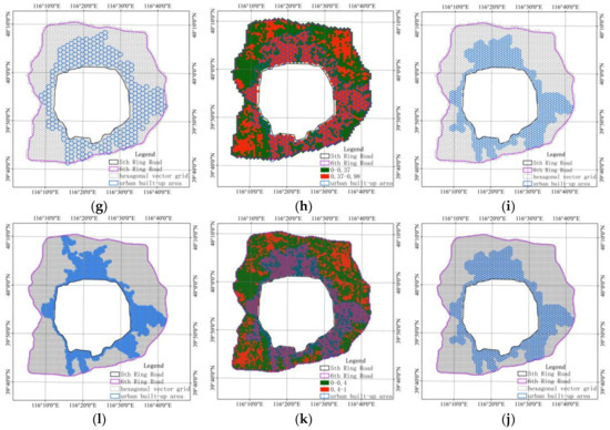 A hexagonal vector grid with a 1920 m edge was generated for the area between the 5th and 6th Ring Roads of Beijing (Figure 9a). The impervious surface density within each hexagonal cell was calculated using the zonal statistics module of ArcGIS 10.3. The resultant impervious surface densities were then grouped into two classes using Jenks natural breaks algorithm. The regions with impervious surface densities lower than 0.294 were defined as low-value regions, whereas those with densities exceeding or equal to 0.294 were defined as high-value regions (Figure 9b). Without affecting the continuity and closeness of the hexagonal vector grid, the low-value and suspended hexagonal cells on the edge were deleted. Consequently, the urban built-up area on the 1920 m scale was obtained (Figure 9c). In the same manner, the urban built-up area at the 960 m scale was extracted (Figure 9f) based on the urban built-up area boundary shown in Figure 9d. The threshold value for discriminating the impervious surface densities was 0.353 at the 960 m scale. The above-mentioned steps were repeated to extract the urban built-up areas of Beijing at 480 and 240 m scales (Figure 9i,l). The thresholds used for classifying impervious surface densities by the Jenks natural breaks algorithm were 0.374 and 0.4, respectively.