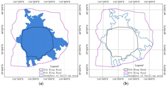 The Beijing built-up boundary: (a) overlaid on the original remote-sensing images; and (b) overlaid on the land cover classification map of the area within the 6th Ring Road.