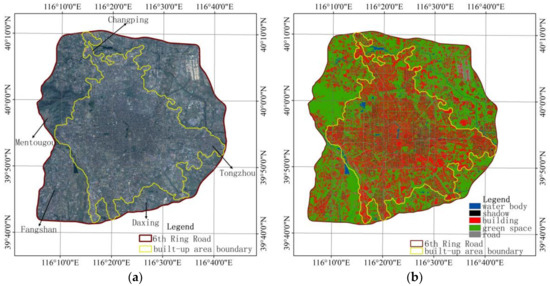 Our study area is the region of Beijing within the 6th Ring Road. Figure 1 shows the true-color GF-2 remote-sensing images of Beijing in 2015 at a spatial resolution of 0.8 m. The original GF-2 image data is derived from the China Centre for Resources Satellite Data and Application. The remote sensing data contains four multi-spectral bands (red, green, blue, and near-infrared) and a panchromatic band. The spatial resolution of the multi-spectral band is 3.2 m and the spatial resolution of the panchromatic band is 0.8 m. The Gram-Schmidt algorithm was used to generate higher spatial resolution multispectral images by fusion of lower-resolution multispectral images and higher-resolution panchromatic images [36].
