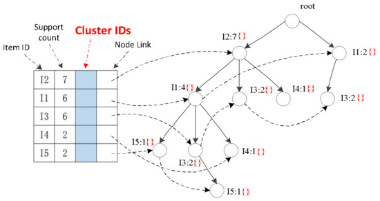 FP-GCID is a novel FP-Growth algorithm based on Cluster IDs, as shown in Figure 1. In the table on the left side of Figure 1, we insert a new column between column 2 and column 3, namely, ‘Cluster IDs’. This column stores the IDs of clusters. Moreover, we rebuild the FP-Tree, as shown in the tree on the right-hand side of Figure 1. The red brackets contain cluster IDs corresponding to the nodes.