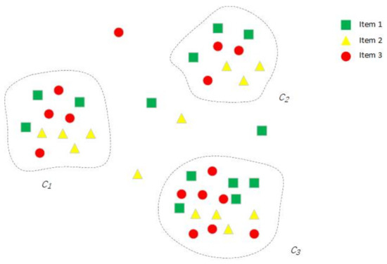 Figure 2 illustrates clusters that have three items, i.e., A = {Item1, Item2, Item3}, and C = {c1}. We choose the cluster c1 as an example. The number of each item is {|Item1|, |Item2|, |Item3| = {3,4,4}, and the total items in cluter c1 is |c1| = 11. Then, according to formula 1, we can obtain the probabilities of items in: .