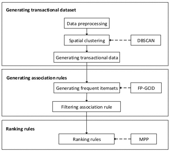 The experiment is divided into three phases (Figure 3). The first phase is used to generate the transactional dataset, which forms the basis for the experiment. This phase includes two sub-phases: preprocessing and spatial clustering. ARs are generated in the second phase by the FP-GCID algorithm, which is an improved version of the FP-Growth algorithm. Minimum confidence is used to filter uninteresting rules. The third phase is used to measure interestingness rules via the MPP approach.