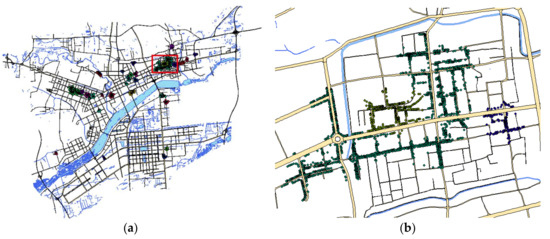 Spatial Data Clustering. (a) Clusters (radius = 110, density = 80); (b) Detailed view of area in red in the left panel.