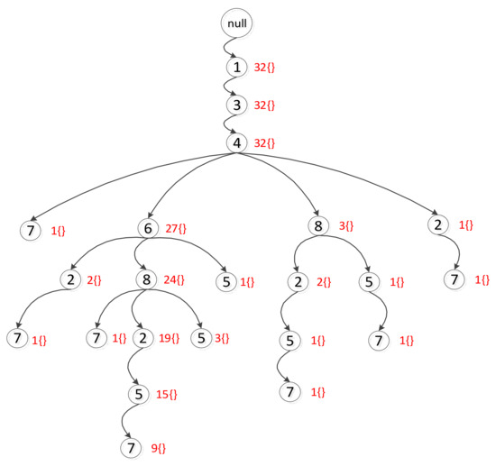 Step 1: Constructing CFP-Tree (Conditional Frequent Pattern Tree). We modify the traditional FP-Growth algorithm as in Figure 7. The nodes contain items (inside the circle). Each node contains the number of this item and the cluster IDs, shown to the right of the nodes. For example, the first node behind the root node represents item 1, and there are 32 transactional data items containing item 1. Specifically, every transactional data item includes item 1. Additionally, the node contains 32 cluster IDs, corresponding to 32 transactional data items. The other nodes are identical.