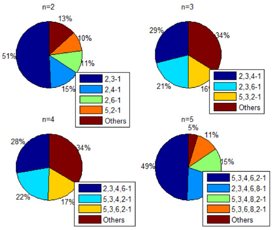 Taking (‘n’ represents the number of the antecedent in an association rule) (top-left part of Figure 9) as an example, the first four rules are listed in the legend, and the rule constitutes the largest proportion of rule type , where . Specifically, is the most important rule in with the consequent equaling 1. This indicates that one should be more considerate of nearby banks and entertainment when deploying a restaurant at a point of interest. In addition, following the change of , , . and are our best rules with a fixed consequent of 1.