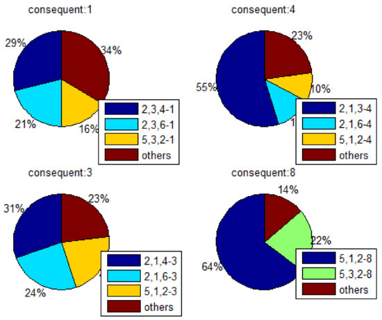 Similar to Table 5, we can find all the best rules corresponding to different quantities of the antecedent with a fixed consequent of 1. Note that the first four rules constitute 77.1 percent of the total probability in Table 5; thus, the other rules can be ignored. Additionally, to provide a better representation, we combine rules that have rank values of less than 0.09, as shown in Figure 9.