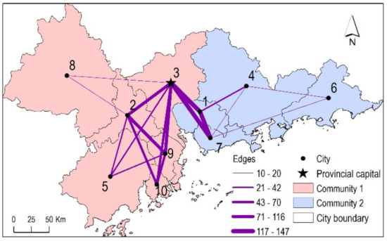 Different from the small world and free scale properties, a community is another basic feature of a complex network [2]. A community is a set of nodes that have more connections among themselves than with the rest of nodes. The research on community detection in complex networks is of fundamental importance. It has both theoretical significance and practical applications in terms of analyzing network topology, comprehending network function, unfolding network patterns and forecasting network activities. Community detection is also an important and fundamental topic in spatial network studies. Community detection can be used to discover interesting spatial patterns and help with understanding the spatial structure hidden in networks. In addition, this method has been used in many areas, such as finding human movement patterns or local pockets of bicycle sharing systems in inner cities [3,4], detecting spatial interaction communities from inner or intra cities [5,6], identifying spatial clusters and partitions of transportation networks [7,8,9,10,11], and discovering global and local structures of research and development cooperation in Europe [12].