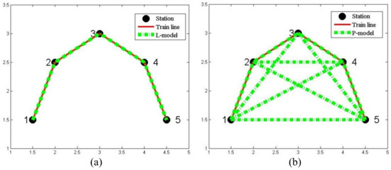 There are two topological models that exist in the transportation network research area: the space L model and space P model [32]. In the space L model, only nearby stations for one train line are considered to have connections. In the space P model, all possible station pairs for the same train line are considered to have connections. Figure 2 shows two networks that are constructed using the two models. As seen in Figure 2, the space P model ignores the topological adjacency between the two nodes and is more focused on the relationship between nodes in the train line. Therefore, the space P model is more suitable for the community detection task. The space P model was chosen to construct the train line networks in this study.
