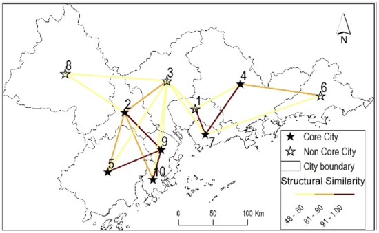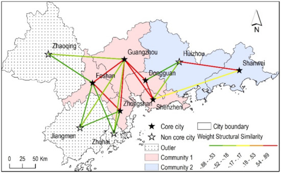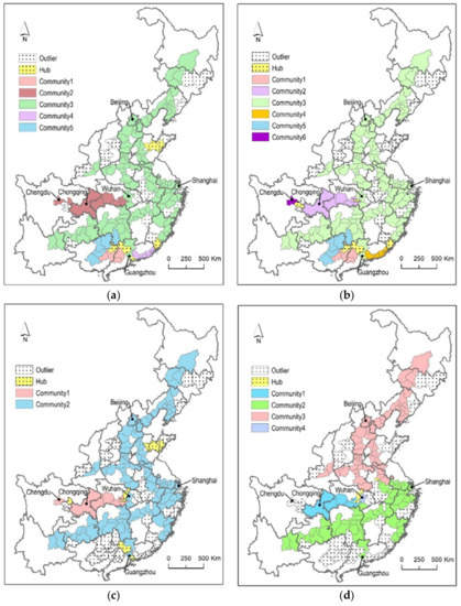 (2) The distribution of the outlier cities discovered by DASSCAN shows the underdeveloped areas in the G-net, which is especially apparent in the southwestern areas. Figure 13b shows that the inner spatial structural similarities are high, but they do not have intensive connections with nearby communities. Finally, when setting more large density parameters, these parameters are identified as outliers, as shown in Figure 13d. The same suggestion can be made to enhance the connections with the spatial hubs, which are shown in Figure 13b.