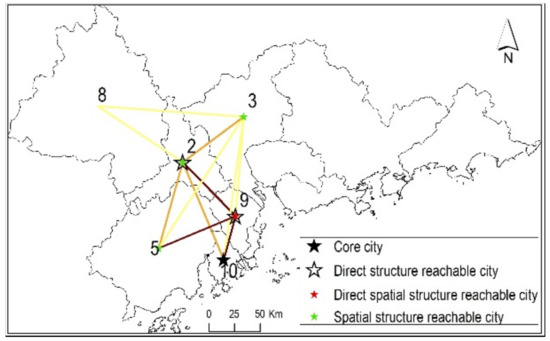 Direct spatial structure reachability. A node u is directly spatially and structurally reachable from node v, ifand, denoted by. The direct spatial structure reachable set of a core node v is denoted by.