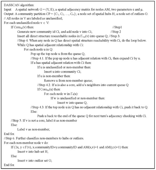 Figure 6 shows the pseudo code of the DASSCAN algorithm. DASSCAN performs an iterative check for each core node of a network and finds all spatially and structurally connected communities, spatial hubs and outliers for the given parameters ε and μ.
