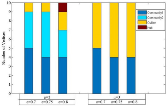 As shown in Figure 3, when ε and μ are set to 0.8 and 2, there are six core nodes in the sample network, which are 2, 4, 5, 7, 9 and 10. In addition, when two parameters are set to 0.9 and 2, only two core nodes remain, which are 7 and 9.