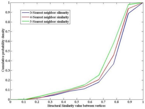 According to the suggested density parameter settings in DBSCAN [33] and SCAN [28], the cumulative probability density (CPD) of the k nearest structural similarity for all nodes is for k equals between 3 and 5, which is shown in Figure 10.