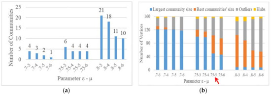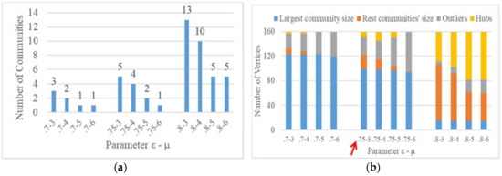 Figure 11 and Figure 12 show the results of the two indicators using different parameter settings for the two algorithms (DASSCAN and SCAN) in the G-net. Based on the parameter choosing criteria stated above, the best parameter combination for DASSCAN is ε = 0.75 and μ = 5, while it is ε = 0.75 and μ = 3 for SCAN.