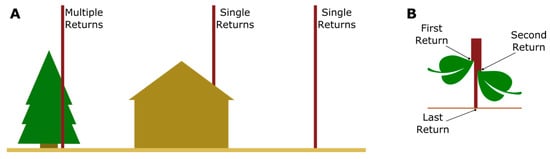 Aerial LiDAR single and multi-return pulses: (A) Example of single and multiple returns; and (B) Example of multi-return, portions of the LiDAR pulse being blocked by physical objects (i.e., tree leaves), while the remainder continues. (Note: elements in the images are not to scale. Aerial LiDAR is collected from above in aviation vehicles).