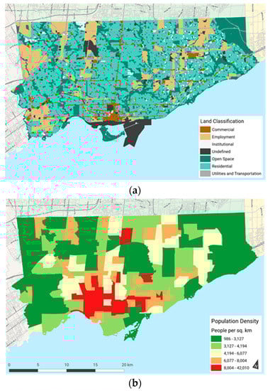City of Toronto: (a) Land use classification; and (b) Population density by neighborhood, people per square kilometer.
