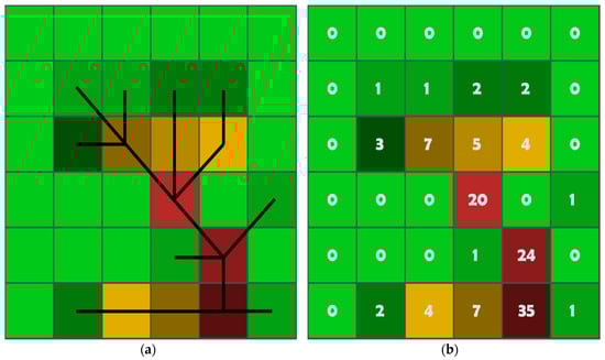Flow direction overlaid with the flow accumulation raster (Panel (a)). Flow accumulation numeric representation (Panel (b)). (Note: the graphical representation of hydrologic flow direction and flow accumulation is not representative of the geographical data presented in this research).