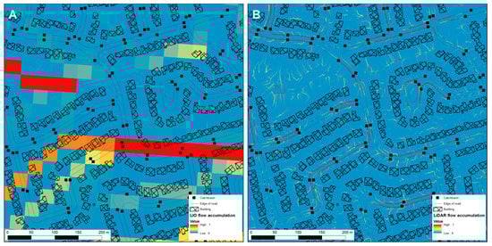 The improved resolution provides an opportunity to analyze the impact of anthropogenic urban features. Flow accumulation modelling with LiDAR elevation data in an urban setting reveals micro-channeling, which results from adjacent curbs and slight topological variations. This is information that could not be detected in large-scale elevation models. When we compared panel A and panel B in Figure 4, we found that the 20-m DEM is insufficient to capture the urban features that channel urban water flows (see Figure 5).