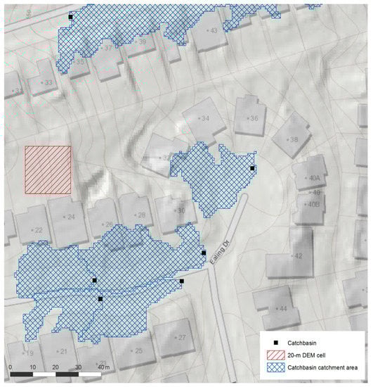 Hydrologic modelling provides a mechanism to simulate water-related events within a geographic area. This modelling uses digital elevation models (DEM) to generate data on water flow direction, accumulation and defined catchment areas [29]. Traditionally, watershed modelling has been performed using regional scale elevation data, with most places in North America consisting of digital products with a pixel resolution of 10–30 m. Although this is adequate for large-scale analysis, the coarse resolution of these digital elevation models is insufficient for performing the complex modelling within the built form of a city. Cities consist of finite details, such as curbs, ditches, buildings and minor topology changes, which are not captured in large-scale DEMs.