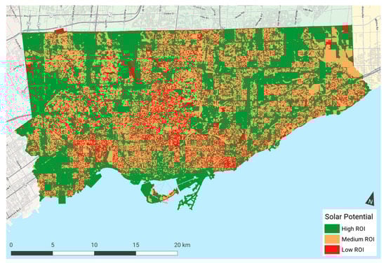 We assessed the solar potential for land parcels in the City of Toronto. The average land parcel size was 1221.98 m2, with a minimum area of 1 m2 and a maximum area of 2,024,351.84 m2. High return solar potential occurred in 56.39% (360.67 km2) of the parcels in Toronto, with medium return potential occurring in 32.65% (208.84 km2) of the land parcels and low return potential for 10.96% (70.07 km2) of the land parcels. When focusing only on the land parcels controlled by the City of Toronto, the percentage of land parcels with high return potential fell to 41.52% (37.40 km2), low return potential increased to 44.33% (39.83 km2) and the remaining 14.26% (12.84 km2) of land parcel had medium return solar potential. In Figure 6, we present the solar potential ROI in the City of Toronto.