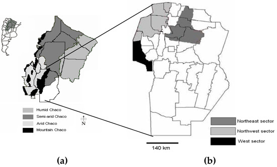 (a) Location of the Gran Chaco and Cordoba Province in Argentina, and different eco-regions within the Gran Chaco; and, (b) Study area in the Cordoba Province; different grey tones indicate the three sectors used to stratify the sampling.
