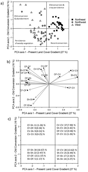 In short, axis 1 represents the trends in present land cover, while axis 2 may be interpreted as an old conversion gradient. Thus, according to the position along both axes, circular samples could be discriminated into four groups (Figure 2a). The two upper groups reveal old conversion, with abandonment occurring in the circles to the left and crop persistence in those to the right. Groups at the lower part of the ordination graph comprise circles with woody vegetation in 1979, which were still persisting in those to the left, but recently converted in circles to the right.