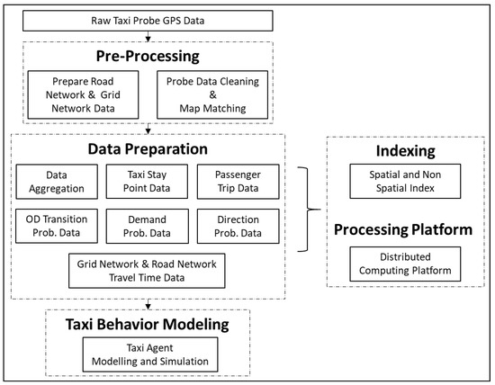 The overall system overview is shown in Figure 1, which has preprocessing, data preparation, and taxi behavior modeling as its stages, and indexing and processing platform as its tool to handle the big data. The preprocessing stage consists of preparing for the grid network and road network, with conducting cleaning and map matching of the raw probe GPS data.