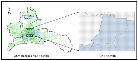 The small grid size of 500 × 500 meters was chosen as grid network, in order to preserve spatial patterns and characteristics in the grid [26], however, the optimum grid size selection is still subjective, as larger grid size could be suitable for suburban or rural areas, but not suitable for dense urban area [27]. A grid network of 500 × 500 meters was constructed, covering all of Bangkok region, as well as surrounding provinces. Here, grid network was represented by G such that G = {g1, g2, g3, g4, …, gm}, where g1, g2, g3, g4, …, gm is each grid or cell. The total of 64,620 grid network features was prepared for Bangkok and the surrounding provinces. In addition to the road network map matching, the cleaned GPS data were also mapped to the grid network G. Figure 2 shows the OSM road network and grid network in Bangkok and surrounding provinces.