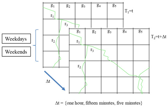 For the grid network mapped data, data were further categorized as weekday and weekend data. Mapped and categorized probe data were then aggregated to each grid network at multiple time steps of 1 h, 15 min, and 5 min. Figure 3 shows grid network G at time steps of Δt.