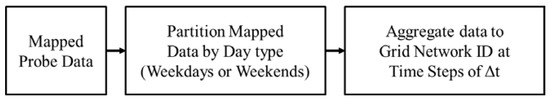 The flow diagram of a data aggregation process is shown in Figure 4. As mentioned, the probe data were, at first, mapped into the grid network. The mapped data were then partitioned based on weekday and weekend. Finally, an aggregation function was used for aggregating the data for time steps of Δt at road network and grid network for both weekday and weekend data partitioned.