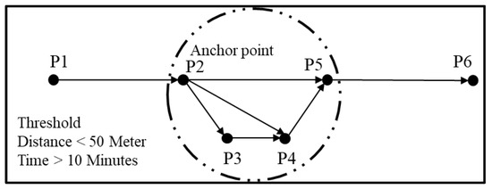Stay point denotes locations where the vehicle (taxi) have stopped or stayed at some location for a certain interval of time, such as a parking place or a gas station, or while looking for a passenger. Taxi stay point cluster location was extracted, which depicts the start location for each taxi during the simulation. The stay point algorithm first checks the distance between the anchor point P2, as shown in Figure 5, with the successor points (P3, P4, P5) within the distance threshold value [28,29]. was chosen to be 50 meters, which was set empirically. Following this, the time span between anchor point and last successor point P5, which was within the distance threshold, was measured. If the time span measured was greater than the time threshold value of 10 min, then stay point locations were detected for the given taxi, as shown in Equation (1).