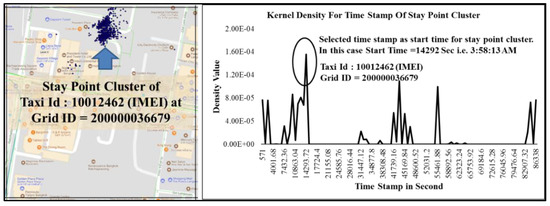 A grid G based DBSCAN algorithm was implemented for each taxi stay point identified as proposed in [30,31,32], where the minimum number of points to form clusters (MinPts) and the maximum distance within two points that belongs to the cluster (epsilon ε) were chosen empirically, depending upon the number of clusters required. The MinPts value was chosen as 100 points, and epsilon distance ε was chosen as 50 m. However, both values could be adjusted depending upon the number of clusters required. Improvement on the clustering algorithm could be achieved with HDBSCAN clustering [33] which uses only single parameter, i.e., MinPts for the clustering algorithm. However, as stay points were extracted before clustering, with a threshold distance of 50 m, all those points that were identified as stay points were within 50 m threshold distance. Hence, traditional DBSCAN, with an epsilon distance of 50 m, was used for clustering instead of HDBSCAN. Finally, the centroid of each cluster was computed that represented the stay location for each taxi. For each of the clusters, the start time was computed that represented the starting time for the taxi during simulation, using the kernel density function for the timestamp of each of the points in the clusters. High kernel density value of timestamp was chosen as the start time. The left Figure 6 shows an example for stay point cluster for taxi id “10012462” at grid id “200000036679”. The right Figure 6 shows the kernel density of timestamp all the stay point cluster for taxi id “10012462” at grid id “200000036679”. For this case, the density at timestamp “14,292 s” (3:58:13 a.m.) was the highest, and hence, start time for this taxi was chosen at 3:58:13 a.m. and the cluster centroid as the starting location.