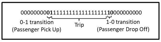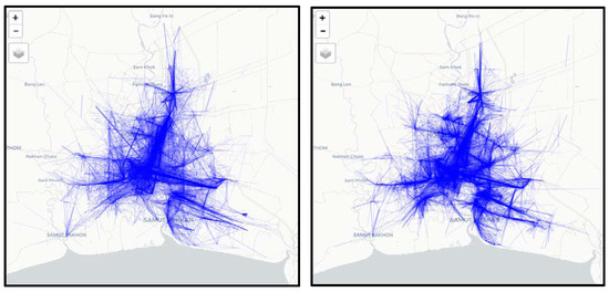 Taxi origin and destination or OD refer to the location where the taxi picked up and dropped off the passenger or customer [34]. The OD of the taxi was extracted from the taxi trip information, which is tracked through taxi “meter status” of probe data, as described in Table 1. As for the trip itself, only those trips were considered whose origin and destination was within Bangkok and the surrounding provinces, as shown in Figure 2. This also suggested that longer trip information was eliminated and simulation focused more on Bangkok region. Figure 7 shows the passenger trip based on pick-up and drop-off transition.