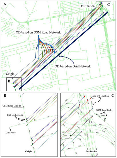 (A) OSM road network and grid network OD comparison; (B) Pick-up location at origin with respect to OSM road network; (C) Drop-off location at destination with respect to OSM road network.