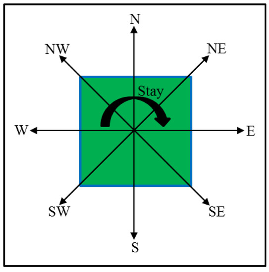 When the taxi has no passenger, the taxi has a total of nine possible cardinal directions to move for searching the passenger, including north (337.5–22.5°), northeast (22.5–67.5°), east (67.5–112.5°), southeast (112.5–157.5°), south (157.5–202.5°), southwest (202.5–247.5°), west (247.5–292.5°), northwest (292.5–337.5°), or stay at the same location. Figure 11 illustrated the nine possible cardinal directions for vacant taxi movement. Based on this assumption, vacant taxi movement was directed for searching of a passenger, with a directional probability which was estimated for both weekday and weekend data, as shown in Equation (4), for each grid at a time interval of every 5 min.