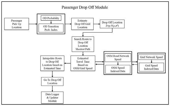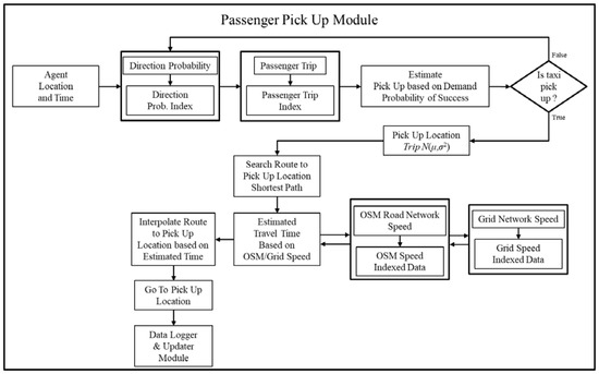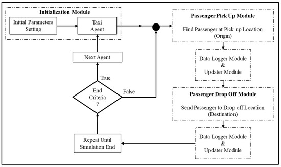 An agent-based simulation model was designed to simulate the discrete event of real taxi movement as it happens in the real-world situation. The entire model was subdivided into five different submodules which were initialization module, passenger pick-up module, data logger module & updater module, passenger drop-off module, as shown in Figure 12.
