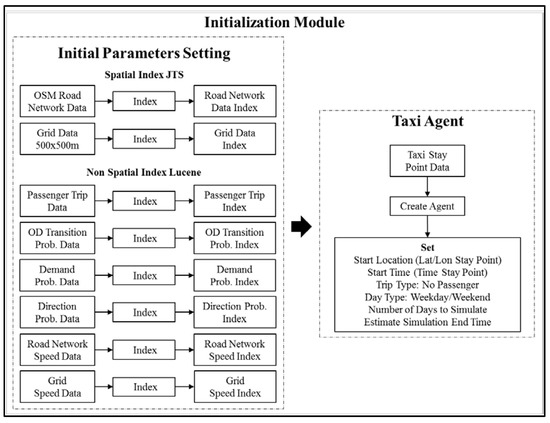 In this module, various simulation spatial and non-spatial parameters were indexed. Spatial data parameters included OSM road network and grid network data as described in Section 3.2, whereas non-spatial data parameters included stay point data, passenger trip data, origin-destination probability, demand probability, vacant taxi movement probability (direction probability), OSM road network, and grid network speed data, as described in Section 4. Figure 13 shows the initialization module of the simulation process.