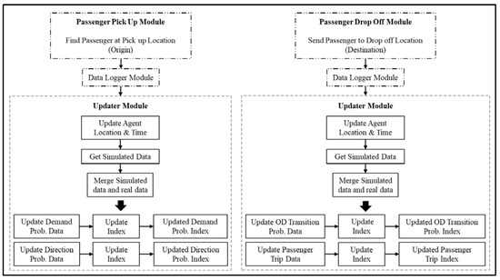 The purpose of the data logger module was to log all the simulated data generated during both passenger pick-up module and passenger drop-off module. Following the data logger module, updater module was called in, as shown in Figure 16. The updater module served mainly two purposes. The first purpose was to update the individual local parameter of an agent, such as agent location and time. The second purpose was to update the global parameters, which included taxi demand probability data, direction probability data, taxi origin destination probability data, and passenger trip data. The global parameter could be updated by merging the simulated data with the real dataset. The new taxi demand probability data, direction probability data, taxi origin destination probability data, and passenger trip data, then could be computed, based on merged simulated and real dataset. The index of the parameters then needs to be updated, which would be used by the agents subsequently during simulation. The update on global parameter provided a mechanism where agent could interact with each other indirectly.
