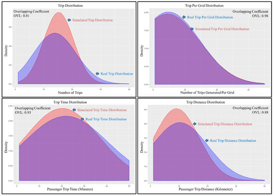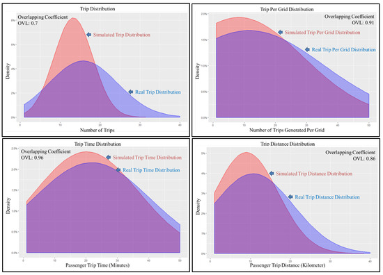 The simulation was conducted in two scenarios, i.e., weekday and weekend, each for an entire day, such that overall properties of simulated taxi service behavior within the city was kept intact, as that with the real taxi service, by adjusting various parameters within the simulation process. Various property comparisons, based on distribution, were conducted between the simulated taxi agent data and the real taxi data, that showed the level of similarity between them. The overlapping coefficient, which is defined as a measure of the agreement between two probability distributions [47], was computed to identify the similarity measurement with a scale of 0 to 1. The measured value of 1 indicated a perfect match, while the measured value of 0 indicated no interaction between the distribution. Four different taxi attributes that included trip generated, trip generated per grid, trip time, and trip distance were compared together regarding their distribution, whereas average taxi speed was compared for hourly variation. Finally, occupancy between the simulated and real taxi data was also evaluated.