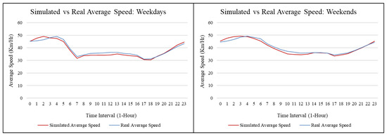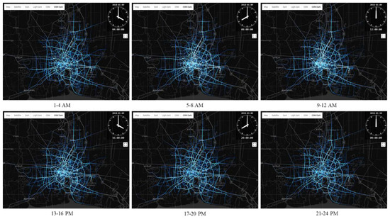 OSM road network based average speed comparison was conducted for time intervals of 1 h between simulated and real datasets for both weekday and weekend. Figure 19 shows the hourly variation of average speed for the entire region of Bangkok and surrounding provinces. Comparison of an average speed showed an R squared value of 0.96 for the weekday comparison and R squared value of 0.97 for the weekend’s comparison. The high R squared value for both weekday and weekend simulated data suggested simulated taxi agents could keep the real taxi properties intact. As mentioned previously, all query, search, and retrieval tasks were conducted over grid network. However, the routing and route interpolation were conducted over the OSM road network, which is shown in terms of taxi agent trajectory in Figure 20. Similarly, the simulated trajectory for the weekday data at a time interval of every 4 h is shown in Figure 21.